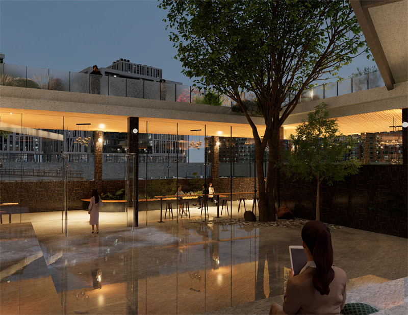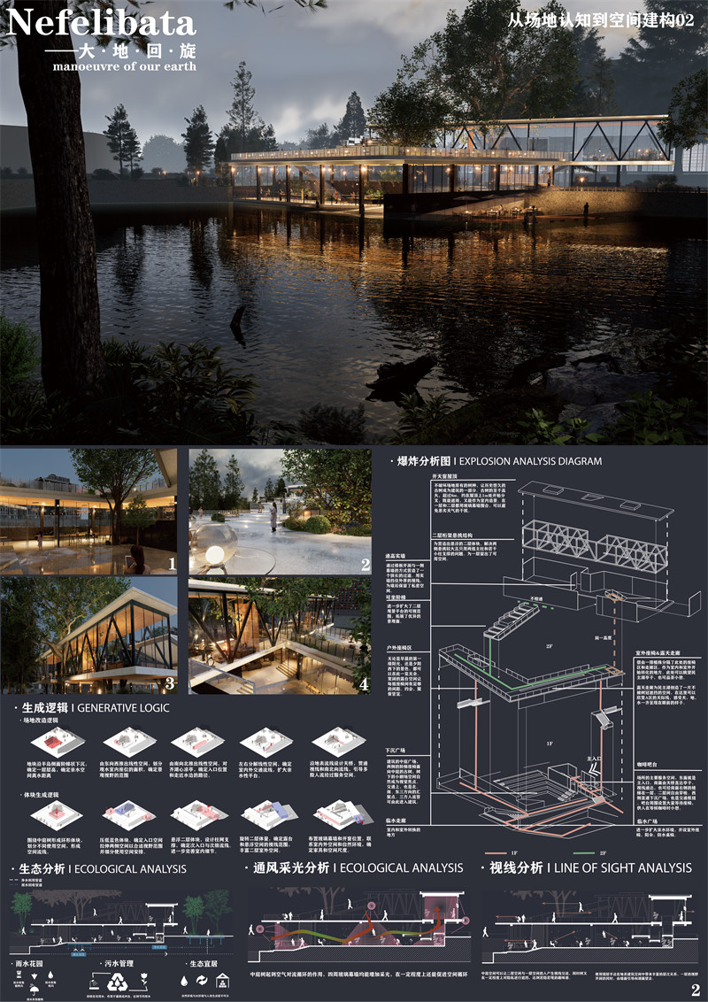 在场地的调研中,我发现大量的学生会来到湖心亭朗读英语、练声,进行这些会产生声响的活动,这些活动会削弱人与自然、与湖水的联系,所以我选择将咖啡厅面向的方向放在场地的西南向。同时,在师生结束了一天的工作生活后,可以来到这里,面向湖水,静静地欣赏属于民主湖的那片落日。看见自然慢慢暗下,灯火点点亮起,属于人的空间融入夜晚的静谧。