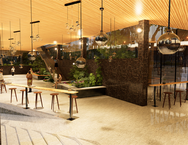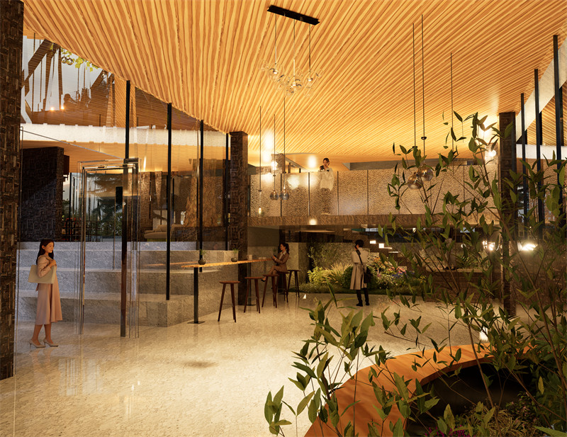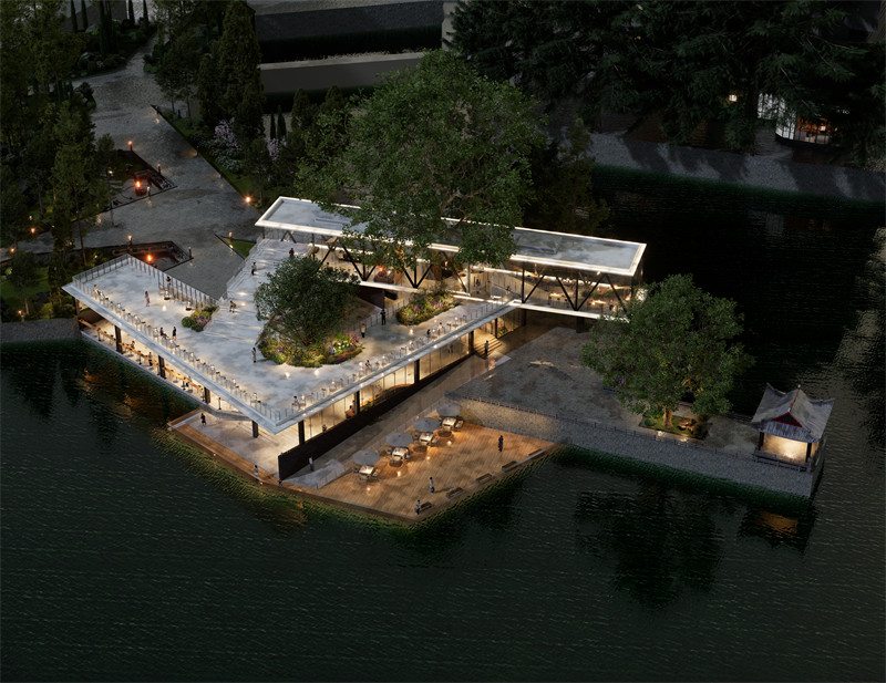 而在整体节奏上,来到这里的人可以自由选择多种与湖水之间的位置关系,找到最适合你的距离。可以在滨水与湖水0距离接触,去听那水被风拂过的响动;可以沿着台阶向上,来到吧台区,感受室内与室外一瞬的转换;可以登上二楼,在回旋中来到树冠的旁边,与屋面花丛,植被一起,远眺湖水。