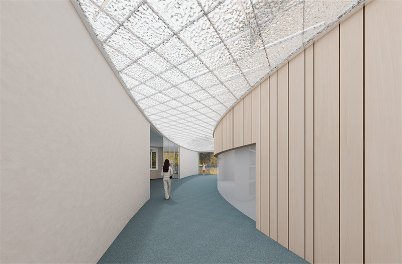 通过现代建筑技术与材料的创新运用,营造出一个既具有艺术表现力,又能满足实际需求的多功能空间。设计采用模数化建造方式,建筑单元之间的尺寸和比例均遵循统一的模块化标准,便于施工、运输和未来的扩展。这种设计方法不仅优化了建筑成本和施工周期,还提供了灵活的空间调整能力,能够根据未来需求的变化进行局部改造或空间重新规划。建筑的结构设计巧妙运用了桁架结构,这使得屋顶看似厚重,却在内部实现了高效的结构支撑。桁架的应用不仅减少了建筑中冗余的支撑构件,还使得屋顶的重量分布更加均匀,提升了整体稳定性。同时,屋顶的桁架结构带来了空间的自由度,避免了传统建筑中常见的柱子和梁的束缚,创造了开阔的无柱大空间。这一设计允许建筑内部形成丰富的光影效果,随着时间的推移,光线在空间中的流动和变化,赋予了这个场所不同的气质与氛围。为大学内部创造了具有休闲交流,展览等多功能的场所。