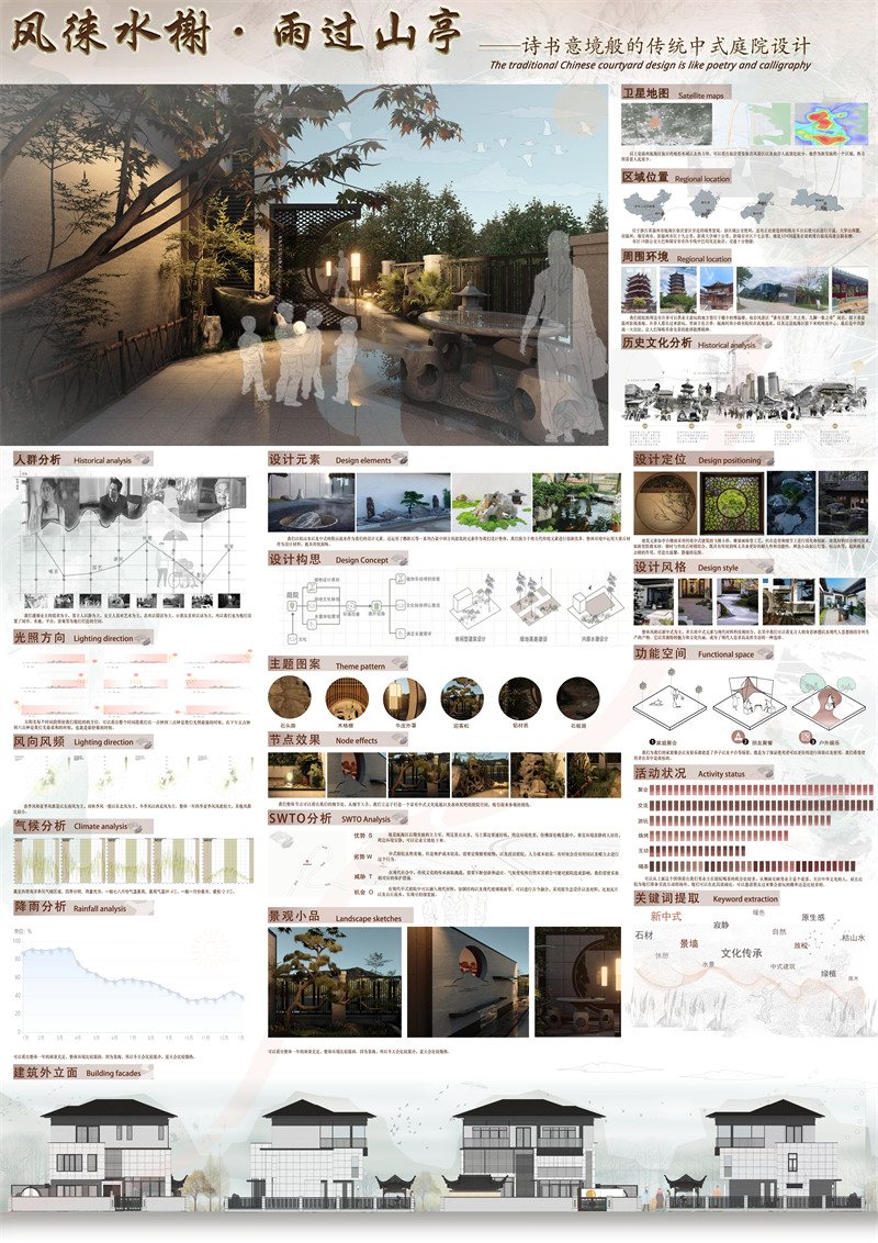 本庭院设计紧扣 “风徕水榭・雨过山亭” 这一主题,旨在营造一种自然、宁静、富有诗意的生活情境。中式园林文化讲究 “虽由人作,宛自天开”,设计以此为基石,尊重场地原始风貌,将自然元素巧妙引入庭院,让风、水、雨、山等自然意象在有限空间内得以具象呈现,使居住者仿若置身山水画卷,随时能感受自然的抚慰与馈赠;同时融入现代设计手法与生活理念,适配别墅主人追求舒适、高效生活的需求,做到传统与现代的和谐共生。