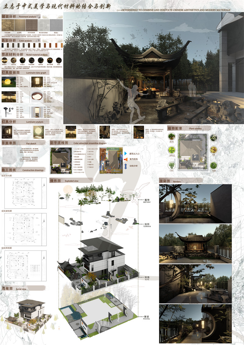 建筑为新中式风格,以灰为主色调,建筑外层使用真石漆涂料、石材干挂、金属五金材质。首层建筑面积约为120m²,共3层(详见施工图)。建筑室内外高差为0.45m。庭院面积约为340m²,主入口为北侧(连小区干道),南侧通景观步道。