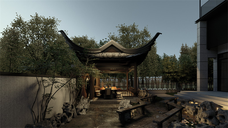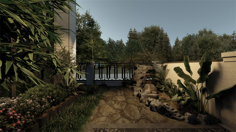 别墅后方庭院则打造出一片幽静的 “山亭” 景观。依地势堆砌的假山怪石嶙峋,山间绿植繁茂,模拟出自然山林的野趣;山腰处,一座青瓦飞檐的四角山亭隐匿其中,曲径蜿蜒而上可达亭中。雨天,静坐亭内,听雨水滴答打落在山石、树叶之上,仿若奏响一曲空灵的乐章,将 “雨过山亭” 的诗意情境诠释得淋漓尽致。