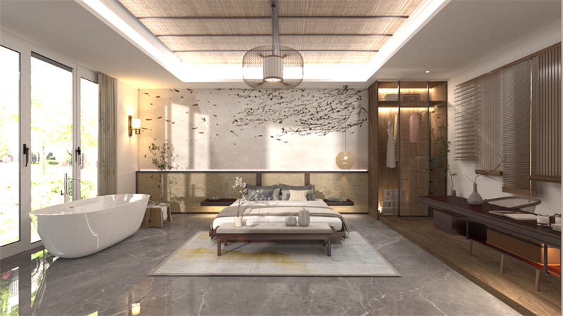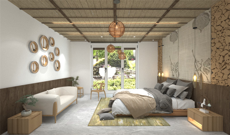 设计风格:质朴自然风。这种风格强调回归自然,追求简约、自然.、朴素的风格,注重原始的材料和手工的质感。在这样的空间里,你会觉得自己仿佛置身于大自然之中,舒适而宜人。在这样的风格装修中,木材是不可缺失的元素,你进入民宿就会看到木质的墙面、家具和一些装饰品等等,它们都散发看秋天的气息。此外,在石材上的运用也相当重要,质朴的石头墻壁或者石质地面会让整个空间看起来更加有质感和稳重感。