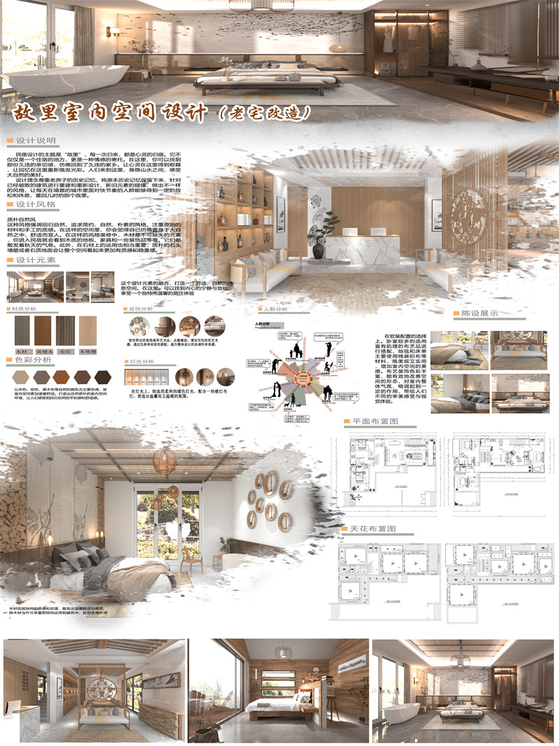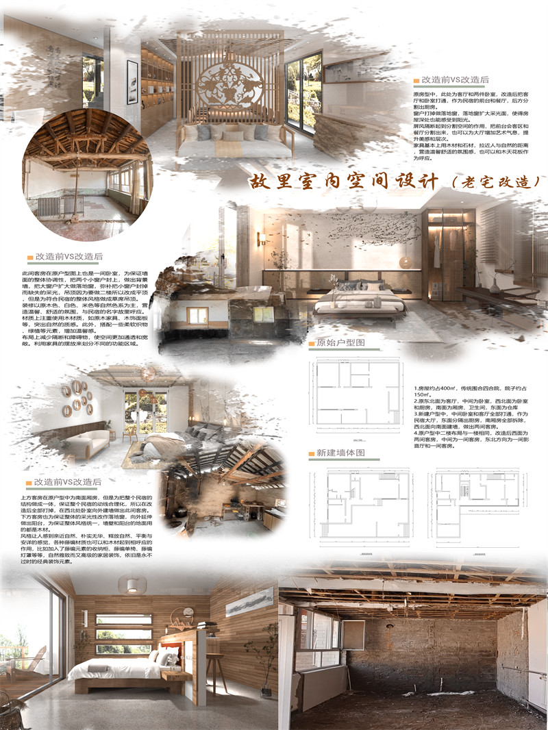 本项目的设计理念“故里”—每一次归来,都是心灵的归宿。它不仅仅是一个住宿的地方,更是一种情感的寄托,在这里,你可以找到那份久违的亲切感,仿佛回到了久违的家乡。让心灵在这里得到慰藉,让回忆在这里重新焕发光彩。人们来到这里,身隐山水之间,感受大自然的美好。尊重老房子的历史记忆,将原本历史记忆保留下来,针对已经破败的建筑讲行重建和重新设计,新旧元素的碰撞,做出不一样的风格,让每天在喧器的城市里面对快节奏的人群能够得到一定的放松和休息,在这里与自然拥抱,舒适与放松成为主旋律,无论是清晨的第一缕阳光,还是夜晚的点点星光,都能让人感受到那份独特的宁静与美好,重回儿时的那个故里。