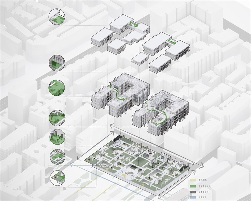 基于习近平主席于2018年提出的“公园城市”概念,此次改造设计我们着重关注了社区周边及其内部绿化情况,希望为居民创造一个生态宜居,设施功能齐全的的生活空间,同时我们也希望曹家巷作为城市绿地,能融入到成都的公园系统之中,发挥其改善城市环境,带动区域发展等作用。通过深入调研分析,我们发现在社区内绿地资源极其贾乏,且周边没有方便抵达的公园。因此,我们重新调整了社区道路布局,在确保消防安全的基础上,规划了三条南北向带有垂直绿化的交通轴线,用以疏通内部道路。同时在东西向增加了三条线性公园,与内部道路交叉形成步行系统。对于社区内部我们改造的五栋楼房,我们则延续了上述思路,在外围设置了消防环道与地下停车场入口。并将首层全部架空,作为社区公园规划的核心区域。首层设有单元入口、负一层入口及通高天井,其余空间均用于公园规划。在户型设计方面,我们提供了三口之家、二人世界及独居生活等多种选择,并在各楼层相应位置设置架空层,放置公共设施,为住户提供便利。这样既实现了社区公园的公共性与私密性的有机结合,又最大限度地满足了社区居民的需求。最后,在整体规划中,我们开放了整个社区,并设计了楔形入口以吸引人流。同时负一层还设有商业区和菜市场,为居民和外来人员提供服务。