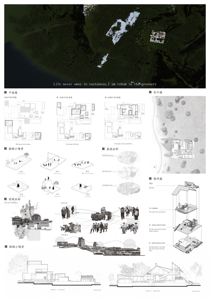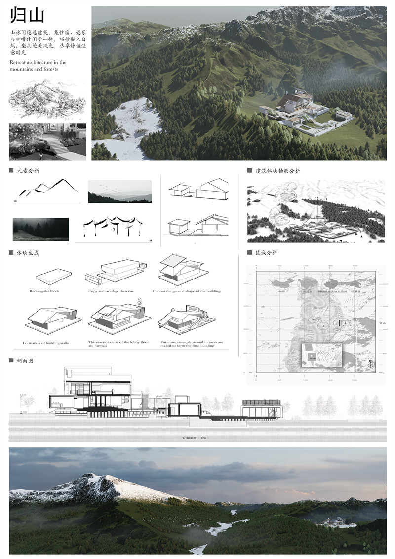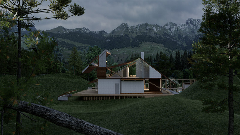 5.场地分析:建筑坐落在一个风景优美的山区,周围环绕着茂密的森林和起伏的山峦。这种选址体现了对自然环境的尊重和利用,旨在让建筑与自然景观和谐共生。