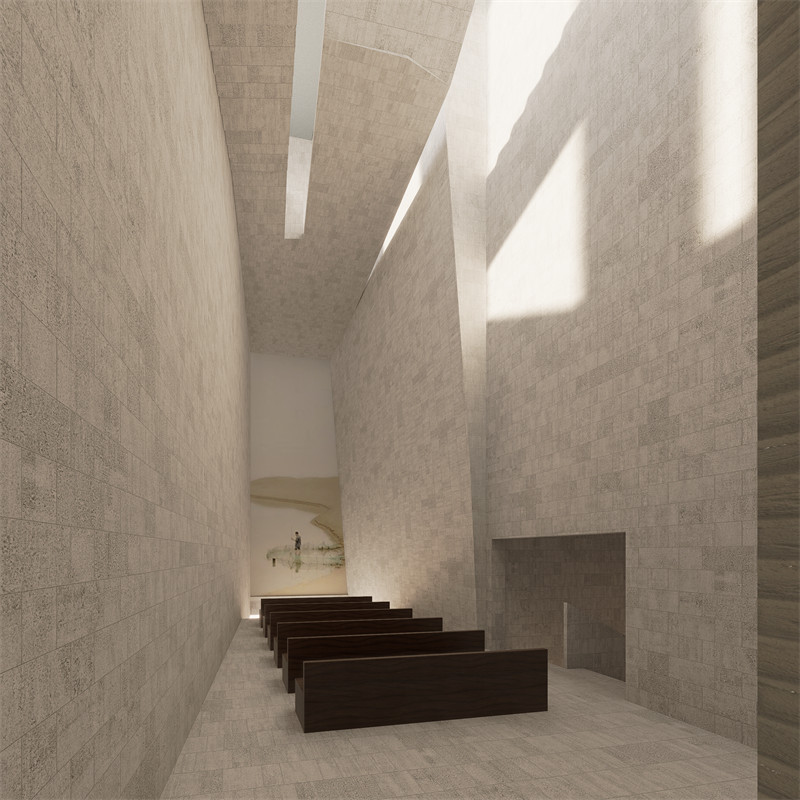 向前走,一排排教堂椅子映入眼帘,一张巨幅照片贴在墙上。抬头仰望,一个人在沙漠中抽水。