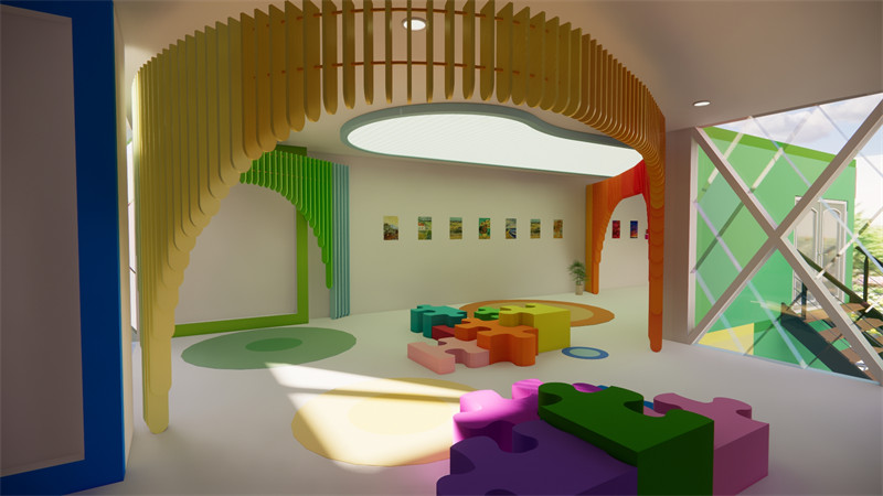 光影效果:通过薄框和大面积的彩色的玻璃幕墙,使得太阳光线在室内呈现色彩光影效果。