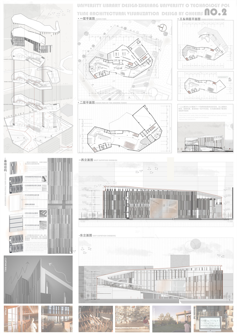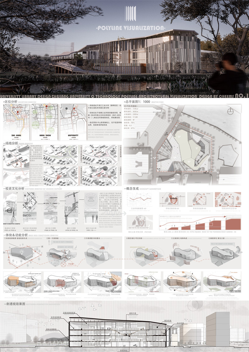 3.设计理念及思路:浙江工业大学本身弘扬意图建设区域特色鲜明、国内一流的研究型大学,其大部分专业分布为理工类,同时在场地南侧为科技馆西侧为科技大楼和旧图书馆,具备科技和规整几何形态,由此,将其理工科专业概念中折线提取而出,利用建筑设计表达而出,形成特色鲜明、数据可视化的校内图书馆。