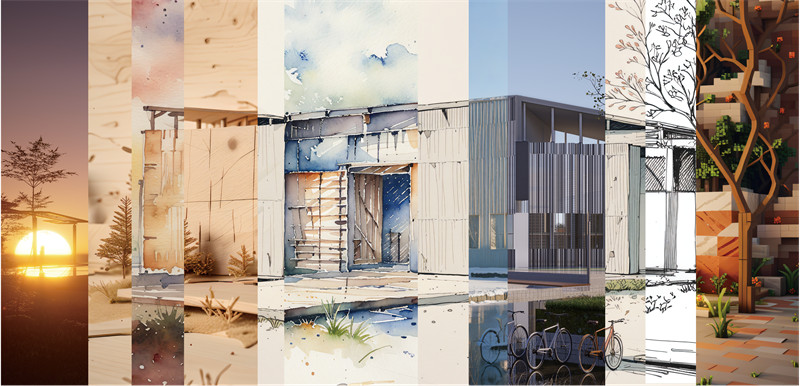 - 为实现多元化表达,一张效果图使用过D5软件自带的AI风格迁移(静帧8)。