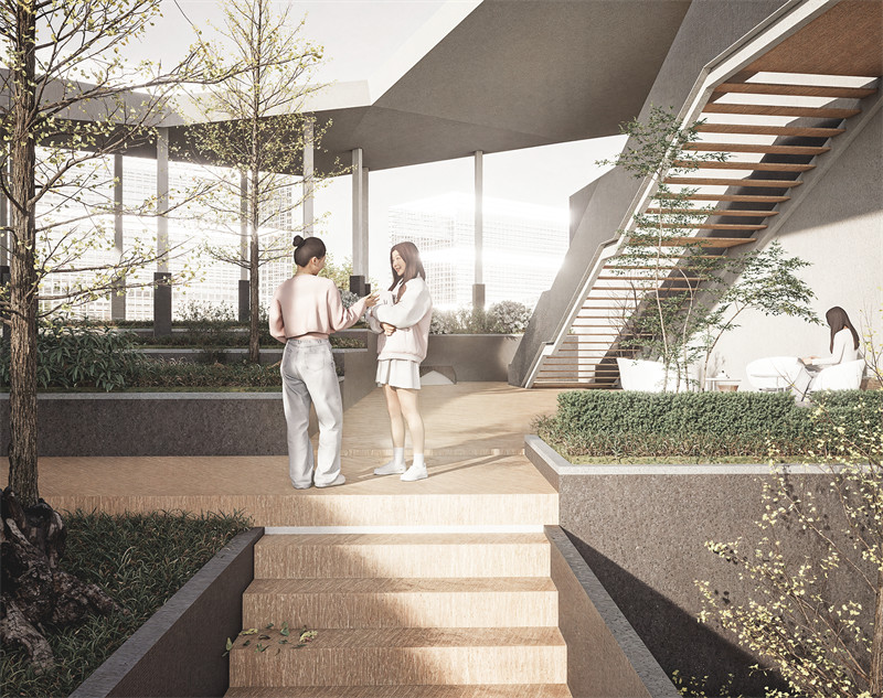 8.概念-体块生成:由此建筑设计上,首先从2D的角度,利用折线并结合场地条件切割场地,与场地学生人群和周围建筑呼应,随后从3D的角度出发,将折线运用至体块生成上,形成上人屋顶和近退台的体块,与运河环境呼应,强化设计理念。