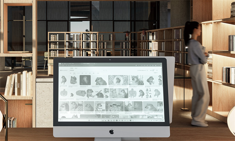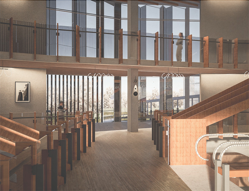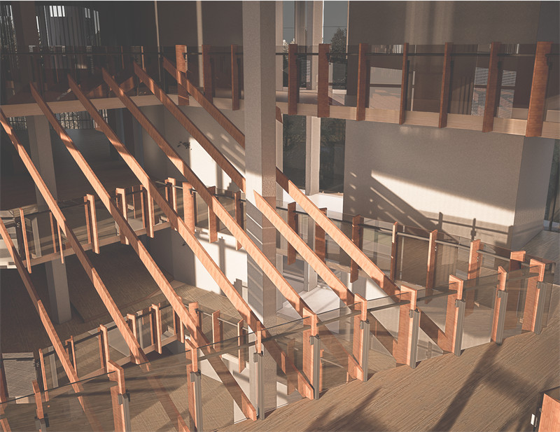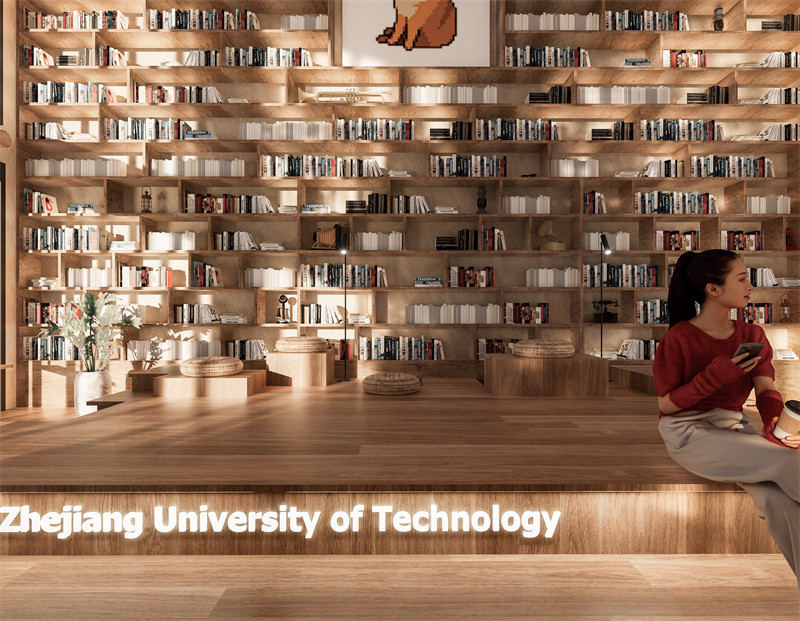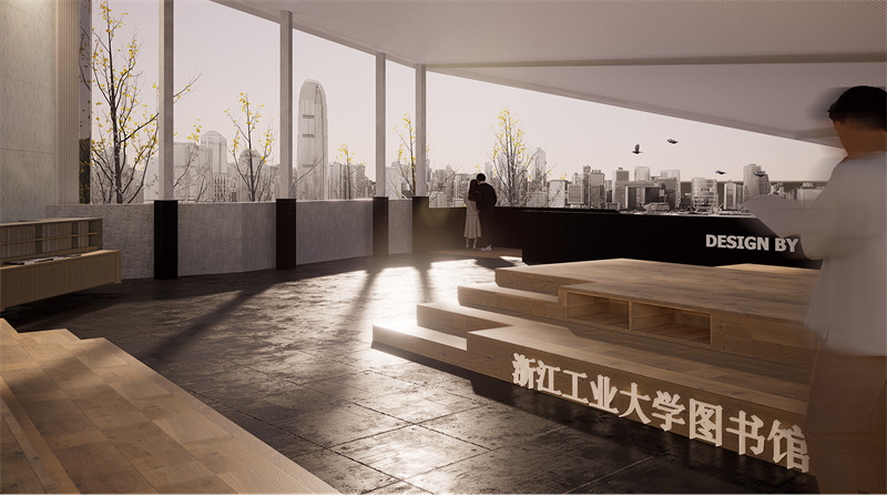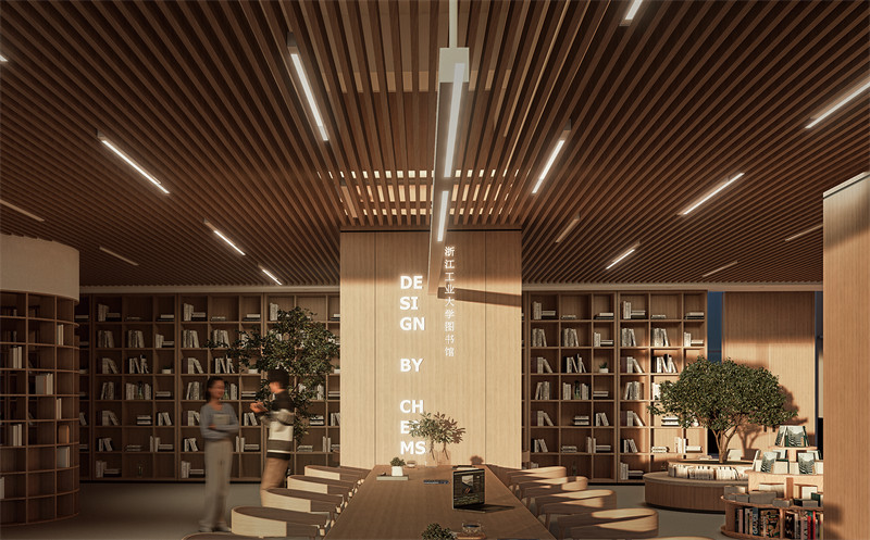 11.室内设计:材质上,选取山核桃木,是呈现黄橙色的暖色木,是浙江杭州市临安的盛产木,因地制宜的同时为室内提供温馨的氛围,为学习阅读的人舒适的心理体验;空间设计上,为不同的阅览空间设计不同的阅览桌、书架布局形式,室内空间丰富性强。