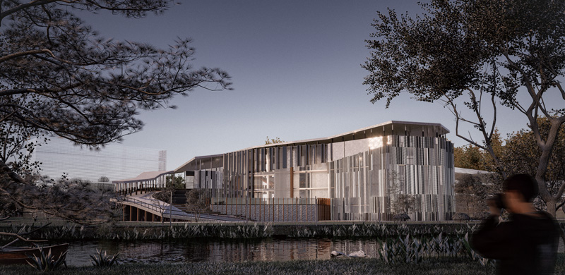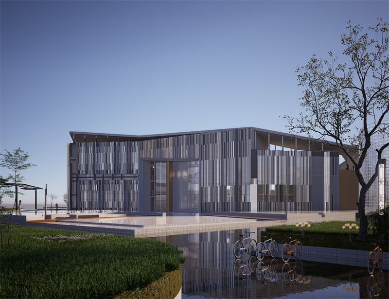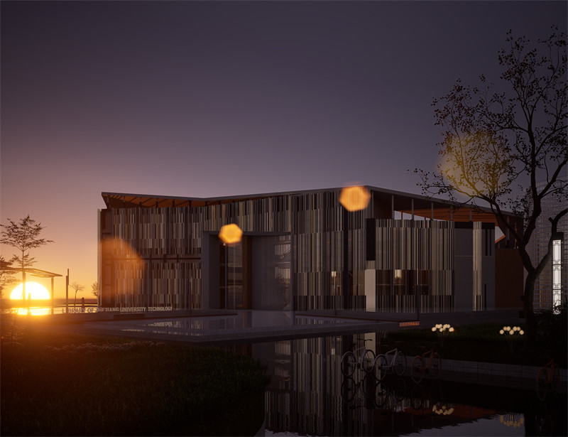 10.外表皮设计:采用参数化表皮,幕墙系统共包含三层,落地窗层-金属格栅层-穿孔铝板层,三层均由金属和超白玻组合而成,保证内部采光需求,同时参数化组合使得立面随机性、多样性增强,幕墙整体外表皮竖向线条呈现出书籍合上的形象,与“图书馆”这一功能符合,强调形成追随功能。