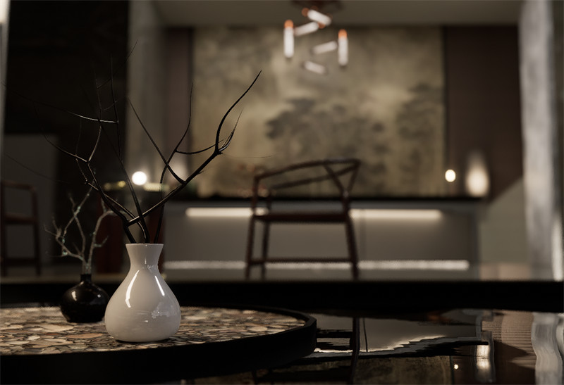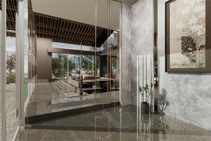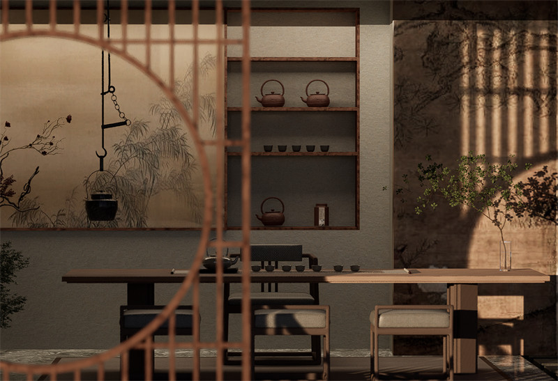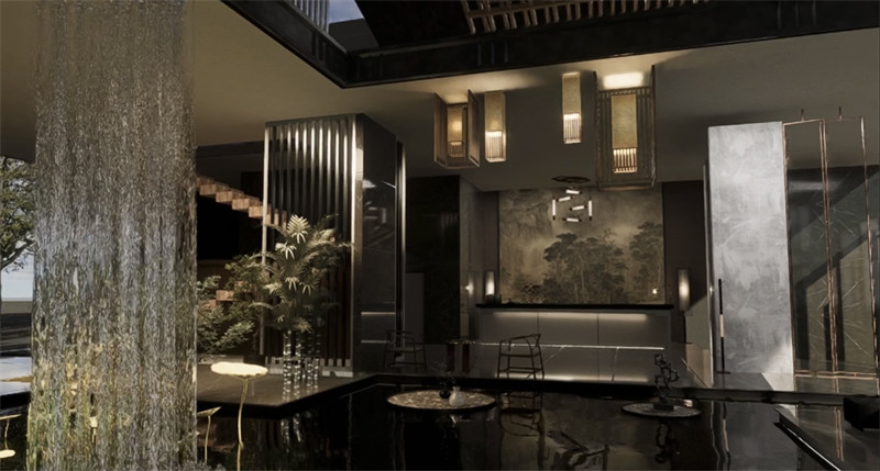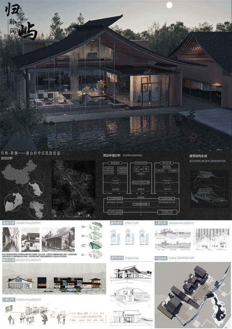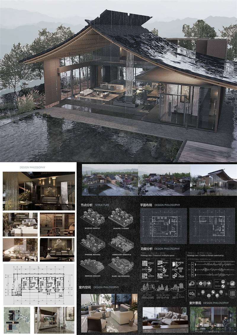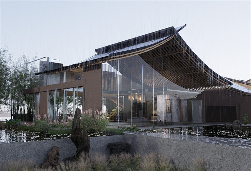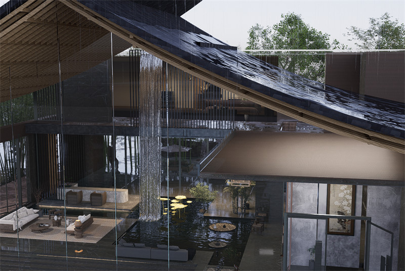 建筑群落又三部分组成,主建筑设为民宿大堂,一楼挑空处设人工循环水瀑布,使游客仿佛置身于山林之间。二楼做茶室,同时提供传统文化体验的空间,起到宣传与展示的功能。第二部分建筑功能设为餐饮服务,康山村临近太湖,著名水产太湖三白是当地特色,可做特色餐厅供游客体验。第三部分为民宿客房区,设为静区,前后有庭院,可供旅客欣赏池水与山色,打通视线体会自然。