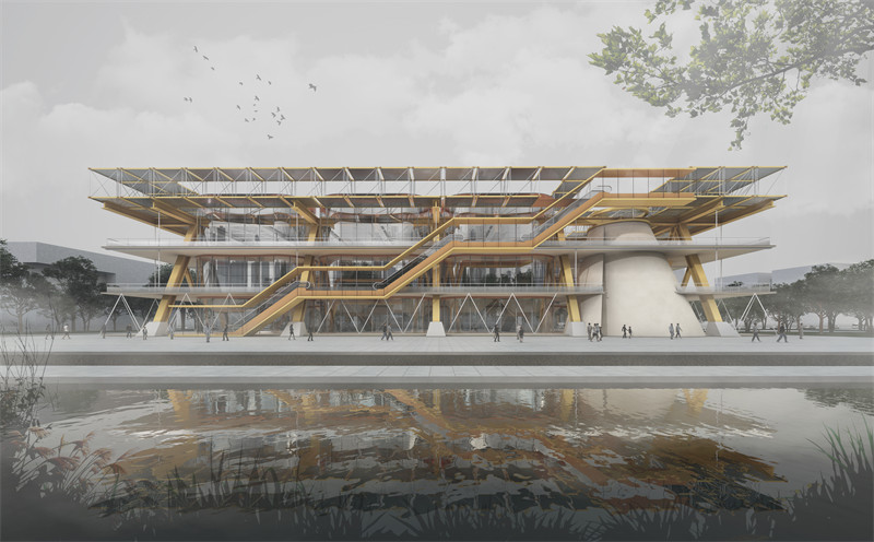 设计充分考虑了建筑的功能性、可持续性及美观性,采用工业化材料与装配式技术,以实现高效施工和长期运营的优化。在设计理念方向,考虑使用Grasshopper Photoshop,对场地周边环境进行参数化设计,并在风格考虑上采用工业风融合,项目灵感来源于现代工业美学,通过使用钢材、玻璃和混凝土这些典型的工业材料,构建出一个具有工业粗犷感与文化创意氛围的活动空间。