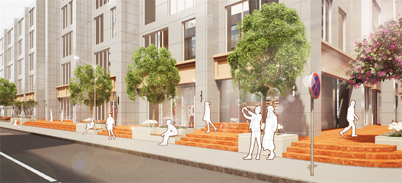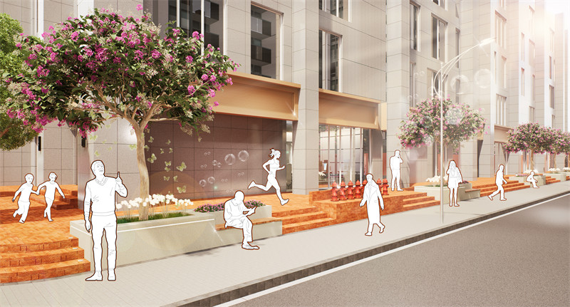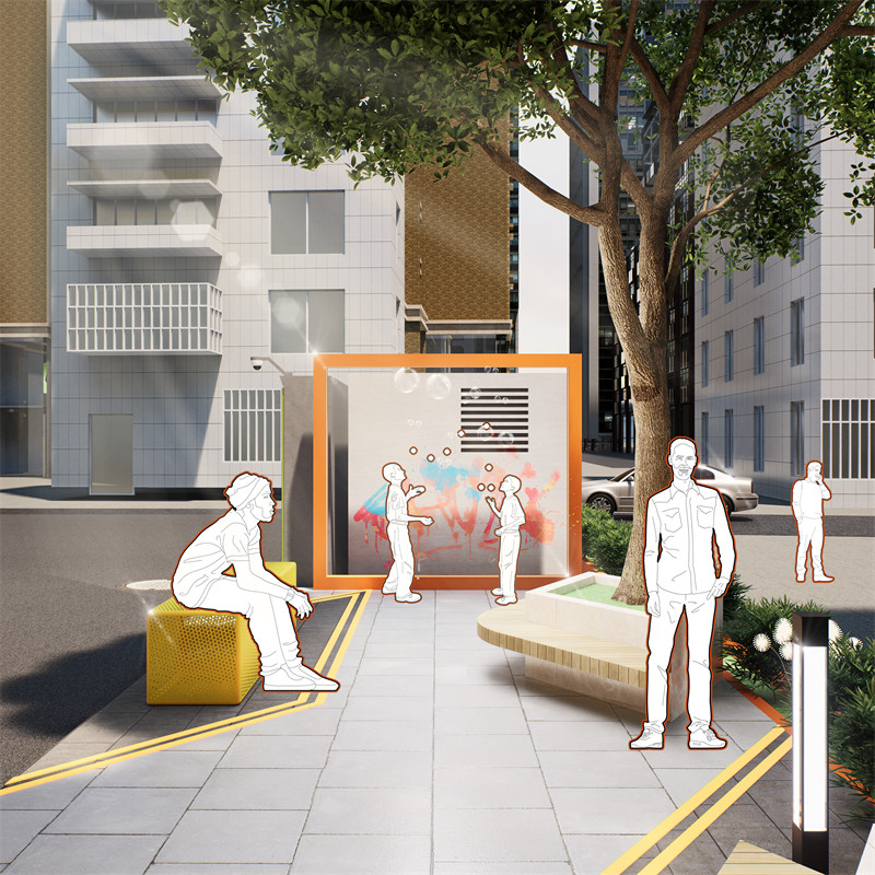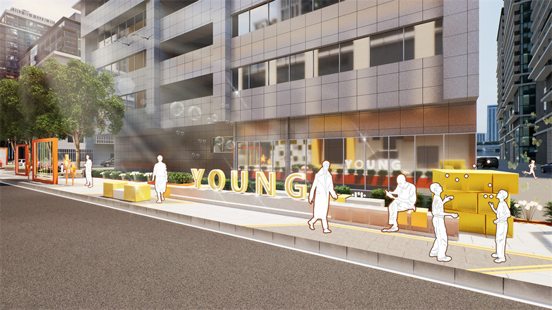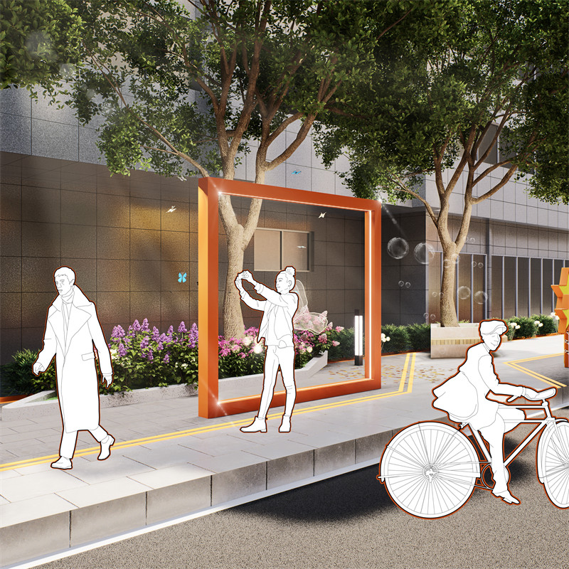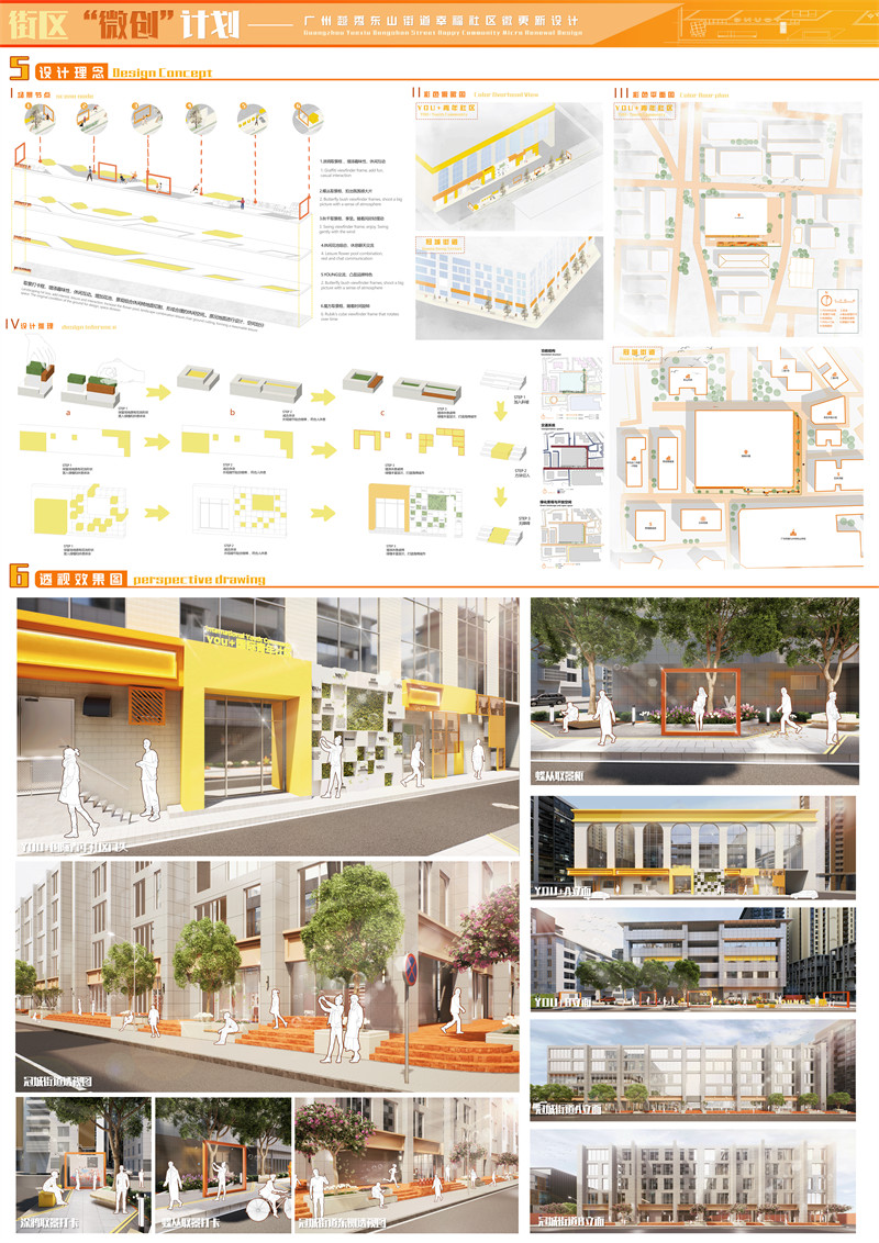 采取的主要设计做法如下:1.空间重组,降低流速,平衡公共交通,扩大人行空间。为停留和活动创造更多机会。打开和创建街区与特色资源。挖掘与拓展老旧基底潜力,化劣势为特质。利用高差、转角、开合等创造更多变化与层次的空间。2.生活赋能。在节点YOU+青年公寓外立面及门前空地绿化升级,以生活“取景框”为节点理念,在场地内设置4个相框装置,分别搭配街头涂鸦,魔方取景框,秋千取景框及蝶从取景框……,打造可爱、有趣、新奇的生活互动。冠城大厦的改造方案在保留主体建筑原有风貌的基础上,对所有花池实施 “微创” 式改造。精心设置的花池边缘,高度适宜,可供行人随时坐下小憩,畅意闲聊。这些花池巧妙点缀了原本单调的街道,如同一幅画卷上的斑斓色彩,让街道焕发出全新的活力与赋能。3. 文化载入。对“三个项目”原有铺装、花池、转角、门头等特征空间,融入蝴蝶、构筑、光影等元素,进行文化重组。越秀当地文化概念的具象符号转译。通过梯形空间表达脉络故事;利用YOU+图案强化特色标识。 在地面材料和原生植被运用文化载入。4.视觉表情。创造街区形象色为黄、橙色。赋予属地化的特征活力。融合形象色,为创造统一的街区VI和标识系统,构成连续的视觉线索。形象色与VI标识,建立街区的完整品牌性,积极的指引,和充满秩序与活力的生活表情。