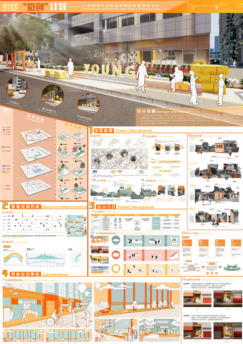 其核心的 “微创” 设计概念贯穿始终,以针灸式、低成本手法巧妙整合空间功能。于空间重组方面,精细调整公共交通与人行空间比例,利用高差转角等挖掘老旧基底潜力,塑造层次丰富的街区空间架构,为街区活力激发筑牢根基。生活赋能上,YOU + 青年公寓的创意 “取景框” 与冠城大厦花池 “微创” 改造,增添生活情趣与便利。文化载入及视觉表情,同样秉持 “微创” 理念,精准融入特色元素,实现情感永续连接。且始终遵循生态优先,以生态友好设计提升环境品质,成功塑造出活力、生态与文化兼具的幸福社区。