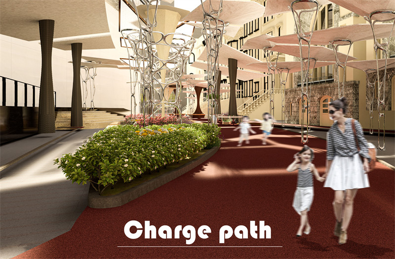 路径规划:人行路径宽度1.5m,台阶宽度≥30cm,适配儿童和老人使用;结合自然纹理设计增添趣味性。