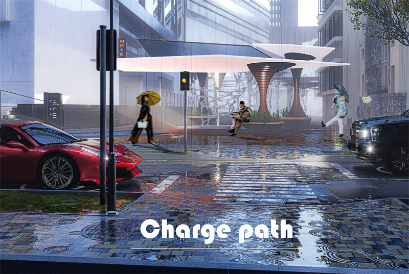 健康与情绪恢复:空气净化装置布局于车流污染源附近,静谧观景绿地用于减缓情绪压力。