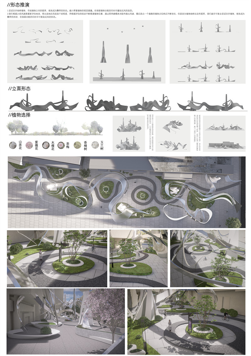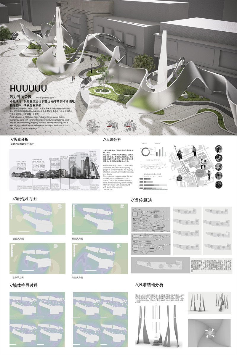 5.场地分析:走访调查广州市越秀区北京路步行街238号恒润广场与周边居民区,场地周边为商场与居民楼。邻近众多学校,毗邻北京路步行街和少年宫,文化底蕴十分浓厚。游客众多,其他为原居住民以及商贩。我们发现,这个场地给人们的第一印象就是风特别大,四周被建筑包裹,风便不断涌进这个场地。通过采访调查也发现这是长期困扰当地居民尤其是老年人的生活问题之一。那么可否能通过建筑利用风力?这便成为我们的初步设想。因此我们就想抓住风这个元素。如果能运用好风,此地就可以打造成极具特点的口袋公园。