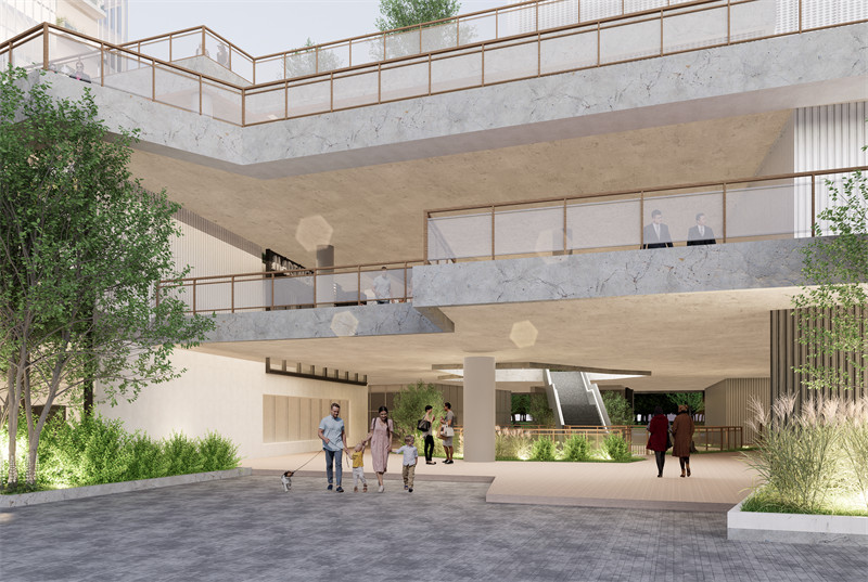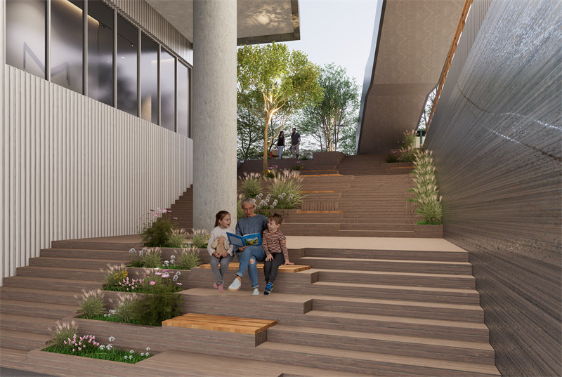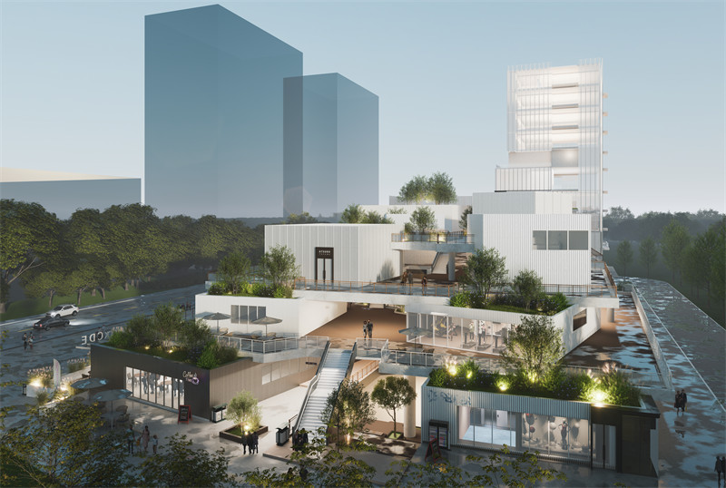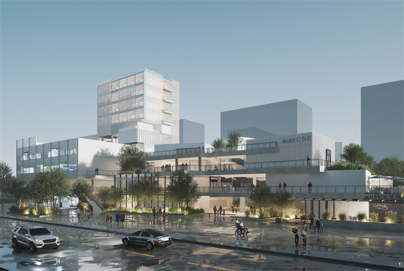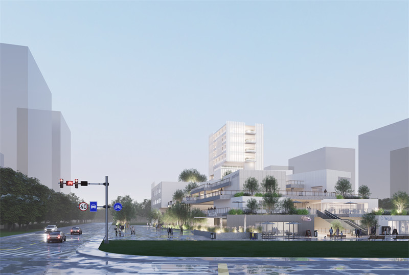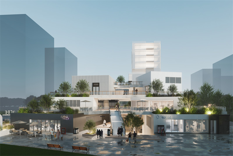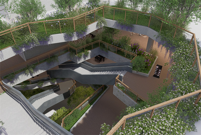 该项目主要以错落体块叠加错落平台的方式搭建,在局部错位交叉地方种上一些绿植,丰富空间层次,而医疗和养老由于流线限制,不宜与其他流线交叉,便把医疗和养老独立设置,用平台将其连接起来。主要手法就是体块错落,营造半室外的灰空间,建筑以体块置于其中。