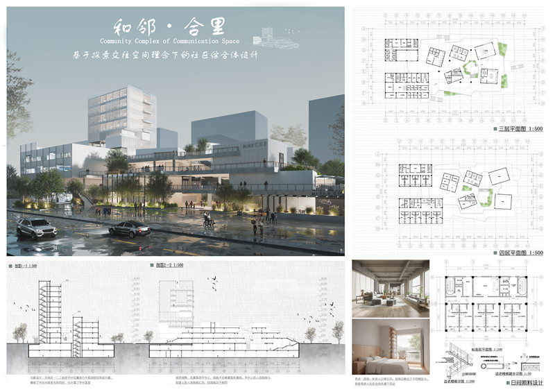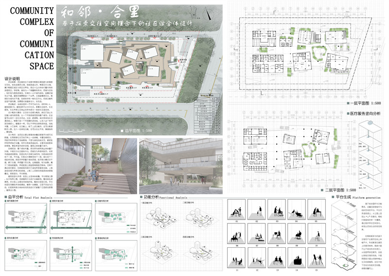 3.设计理念及思路:以交往与空间为概念,旨在打造让社区融入城市的思想,以一个开放的姿态面向整个城市。在这里可以进行一些社会活动,比如:路演等,其次将体现在交通流线上,想要打造一个开放随机的流线,让进入这个半开放空间的人,像散步一样,可以不带有目的性的闲逛,流线丰富,入口多样,在功能上,除了上述功能外,还可以根据附近人群,加入一些其他功能,也可以自主开发,像健身房,展馆等。