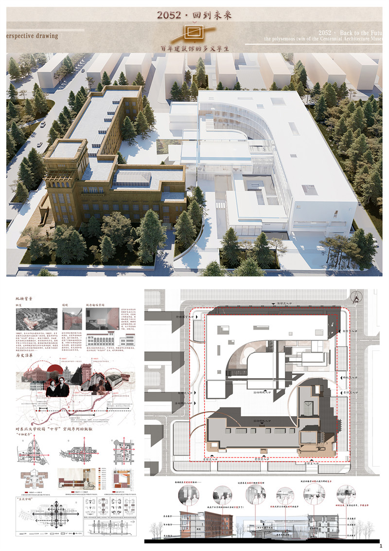 2023年,正值学校百年校庆,回望来时路,空间的连续映射到精神层面反映出一代代建筑学子对母校产生文化上的认同感,2023年,设计以此为出发点,以致敬为源,通过“凝望”、“消隐”、“漫游路径建立”,探究新与旧、虚与实、厚重与轻盈之间的关系,同时,关注到当代建筑教育的时代需求,在功能上相适应,通过空间多义、科技融入、感知共生激活并重塑属于我们的建筑时代记忆,2052年,期待在建筑系馆的每日“漫游”中“回到未来”。