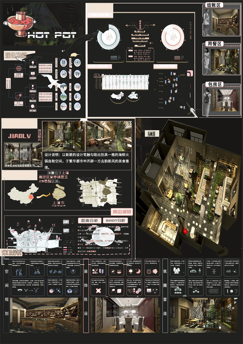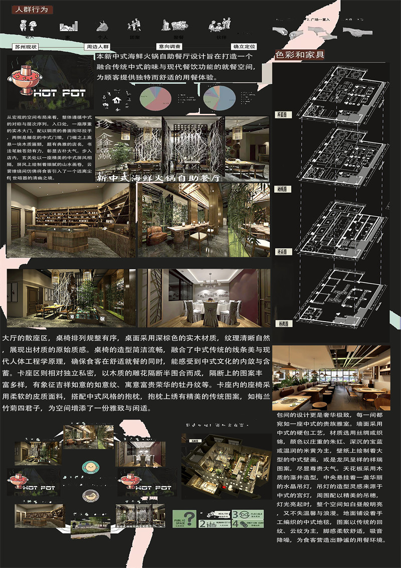 总体而言,这个新中式海鲜火锅自助餐厅的设计在空间布局、色彩装饰、地面墙面材料以及人群行为与动线等方面都进行了精心的规划,旨在为顾客提供独特而舒适的用餐体验。