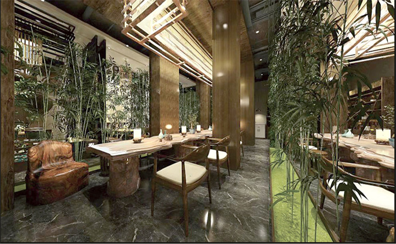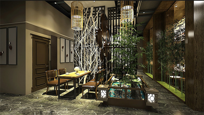 餐厅内融入了中式园林景观元素。在大厅中央或角落设置小型假山和流水景观,水中养有锦鲤,周围配以翠竹、松柏等绿植,营造出一种自然和谐的氛围。同时,在窗边或过道处设置木质花架,摆放时令花卉,让顾客在就餐过程中能够感受到四季的更迭和自然的美好。