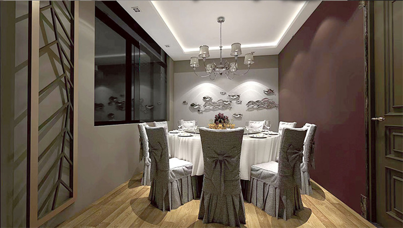 灯光设计是营造餐厅氛围的关键。除了前文提到的吊灯,在整个空间中还布置了多种灯光。餐桌上采用暖黄色的吊灯,能够突出食物的色泽,增加用餐的温馨感。过道和墙边采用壁灯或地灯,灯光柔和不刺眼,既能够起到照明作用,又能营造出一种曲径通幽的意境。在一些装饰性的角落,如展示中式摆件或绿植的地方,采用射灯进行重点照明,突出这些装饰元素,提升空间的层次感和文化氛围。