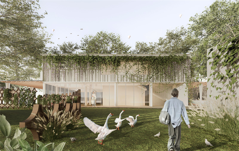 建筑立面采用镂空格栅与植物结合的形式,以独特的表现手法将现代建筑元素与自然生态相融合。与格栅结合的攀爬植物随着季节变化呈现不同的景观效果,赋予立面动态的生命力。植物与建筑的巧妙结合不仅减少了建筑的视觉重量感,还通过自然绿化提升了建筑与环境的整体和谐美感。这种设计体现了对生物的多样性性理念的呼应,同时创造了一个绿色可持续的建筑形象。