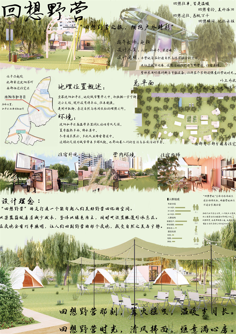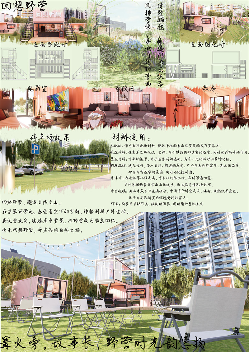 随着人们的生活水平提高,对房屋的需求也多种多样,所以我们设计了一款方便简洁的房屋,以集装箱为主题的集装箱营地。这里,集装箱不再是冰冷的钢铁盒子,而是被赋予了全新生命的时尚居所。色彩鲜艳的箱体相互拼接,构成了一个充满活力与创意的独特世界。营地场地位置北临河岸,风景秀丽,南靠住宅区,有一种城市与自然的割裂感。营地集住宿,餐饮,娱乐为一体,营造出独特的空间氛围。