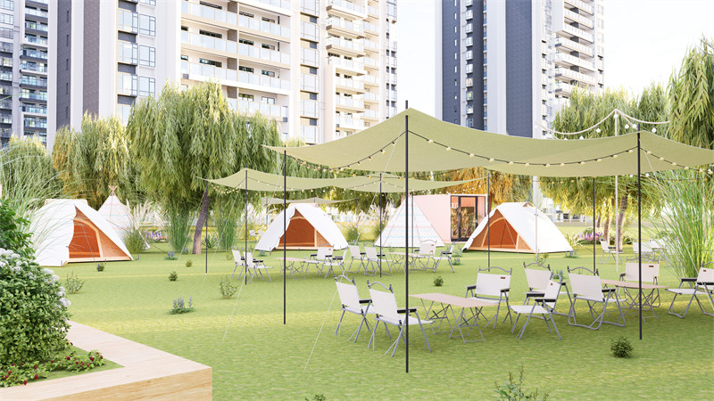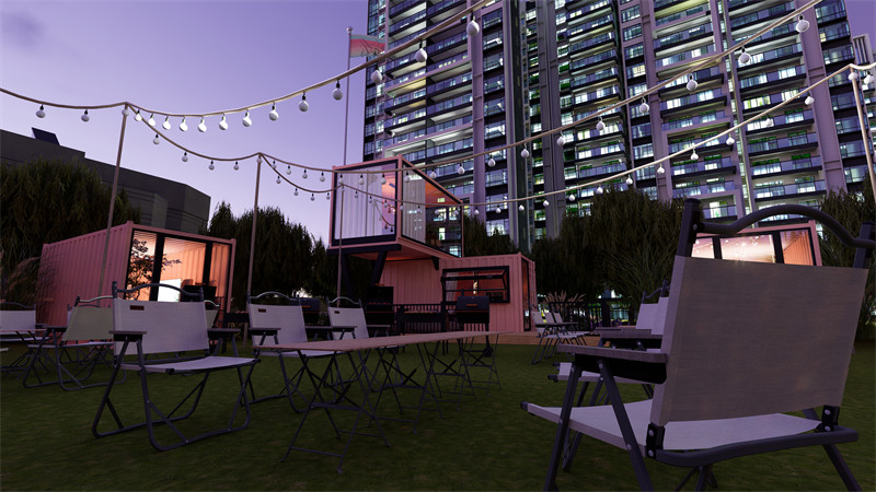 起居与休闲:有改造成客房的集装箱,内部配备基本床铺、桌椅等,能提供舒适的居住体验,宁静舒适,柔和的色调和质感材料,打造宁静的睡眠环境。休闲区域设有遮阳棚餐桌,露天烧烤架,帐篷等,可举办各类团建、娱乐活动。