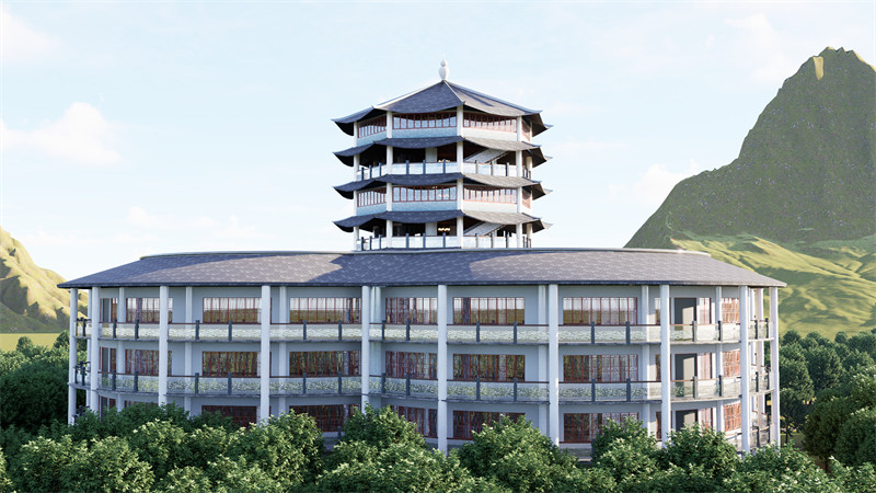 材质选择:外墙使用夯土或砖石建造,体现了土楼的厚重感;而内部则更多运用木材和竹材,创造温馨舒适的居住体验。功能分区与环境营造:读书学习区:设立一个安静的书房,配备书架、桌椅等设施,适合阅读和写作。这里不仅放置古籍和现代书籍,还布置有文房四宝,旨在营造一个充满文化底蕴的学习空间。喝茶赏景区:在美人靠附近设有茶室,提供品茶和休闲的场所。透过大窗户,可欣赏到庭院中的自然美景,享受片刻宁静。观景平台:高楼塔的各楼层均设有观景平台,人们可以从不同高度俯瞰四周景色,感受建筑与自然的完美融合。