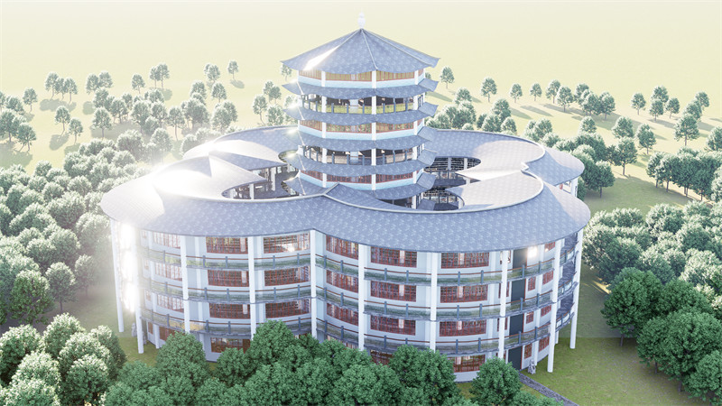 建筑不仅拥有丰富的功能分区,还特别注重空间的层次感和视觉效果。中央高楼塔被四合院式的四层土楼环绕,构建出独特的垂直空间结构;四周不同颜色的水池则为空间增添了水平方向上的变化与趣味。无论是在低处细品池中鱼戏、花树映衬下的荷花之美,还是登高远眺,均能给人带来截然不同的视觉体验与心灵触动。