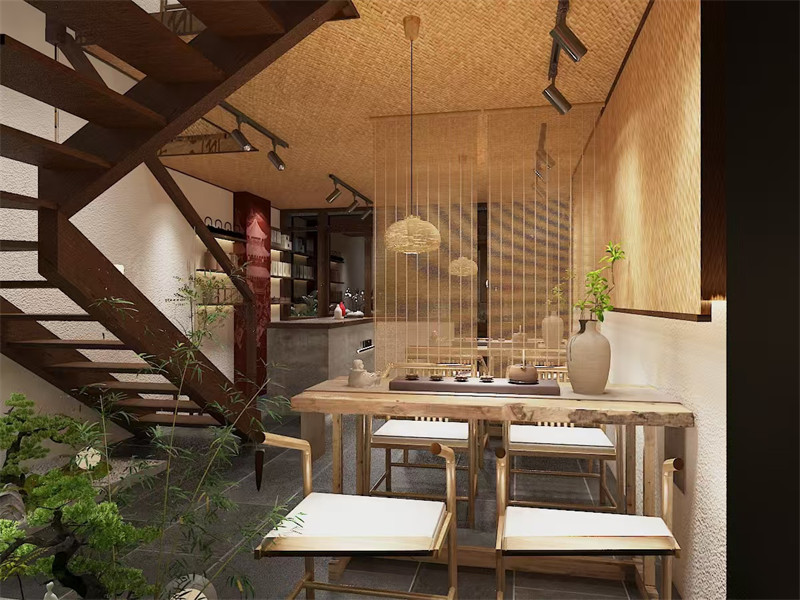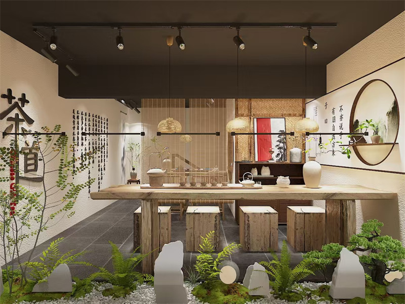 装饰细节方面,充分融入了自然与传统文化元素。天花板采用木质横梁结构,搭配暖黄色的灯光,仿若置身于古老的庭院之中,温馨而惬意。墙壁上,一部分以米黄色的硅藻泥装饰,呈现出自然质朴的质感;另一部分则悬挂着一幅幅精美的书法作品与山水画卷,笔墨之间流淌着千年的文化韵味。地面铺设着深灰色的复古地砖,其纹理犹如岁月的年轮,见证着时光的沉淀。茶桌之上,摆放着造型简约却精致的茶具,或是温润的紫砂壶,或是剔透的玻璃茶杯,每一件茶具都像是一件艺术品,与茶香相互映衬。