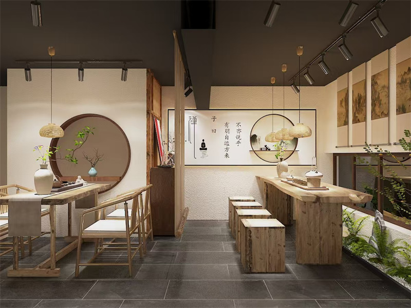 空间布局上,秉持着开阔与私密相平衡的原则。入口处,采用木质格栅作为隔断,既不完全封闭,又巧妙地阻挡了外界视线,引导着客人逐步踏入这片静谧之地。大厅中央设置一方浅池,池内错落有致地摆放着圆润的石子与几尾灵动的锦鲤,水面上漂浮着几片荷叶,微风吹过,泛起层层涟漪,为整个空间增添了一份生机与灵动,此为“澜”之体现。环绕浅池,布置着数张简约而不失古朴的茶桌,每张茶桌之间保持着适度的距离,确保客人在品茶时拥有相对独立的空间,享受那份宁静与自在,此乃“静”之所在。在角落处,精心打造了几个半封闭式的雅间,雅间内以淡雅的布帘相隔,墙上挂着意境深远的字画,为客人提供更为私密、静谧的品茶环境,适合商务洽谈或好友小聚。