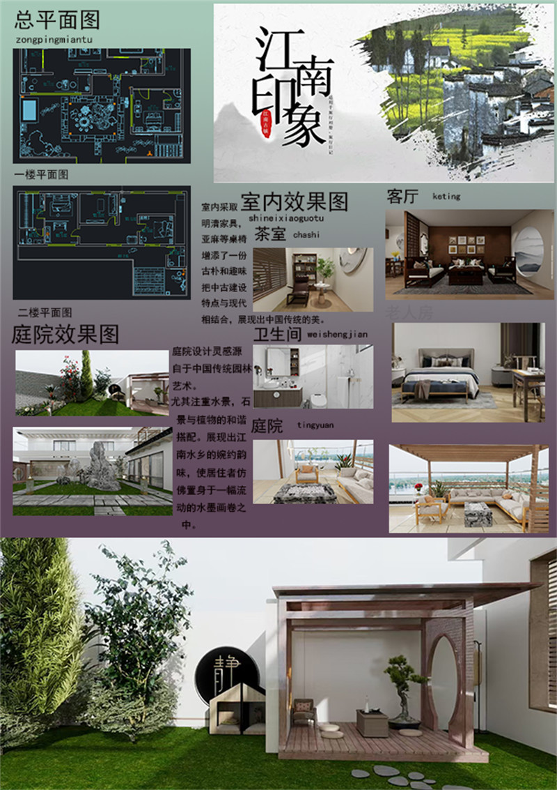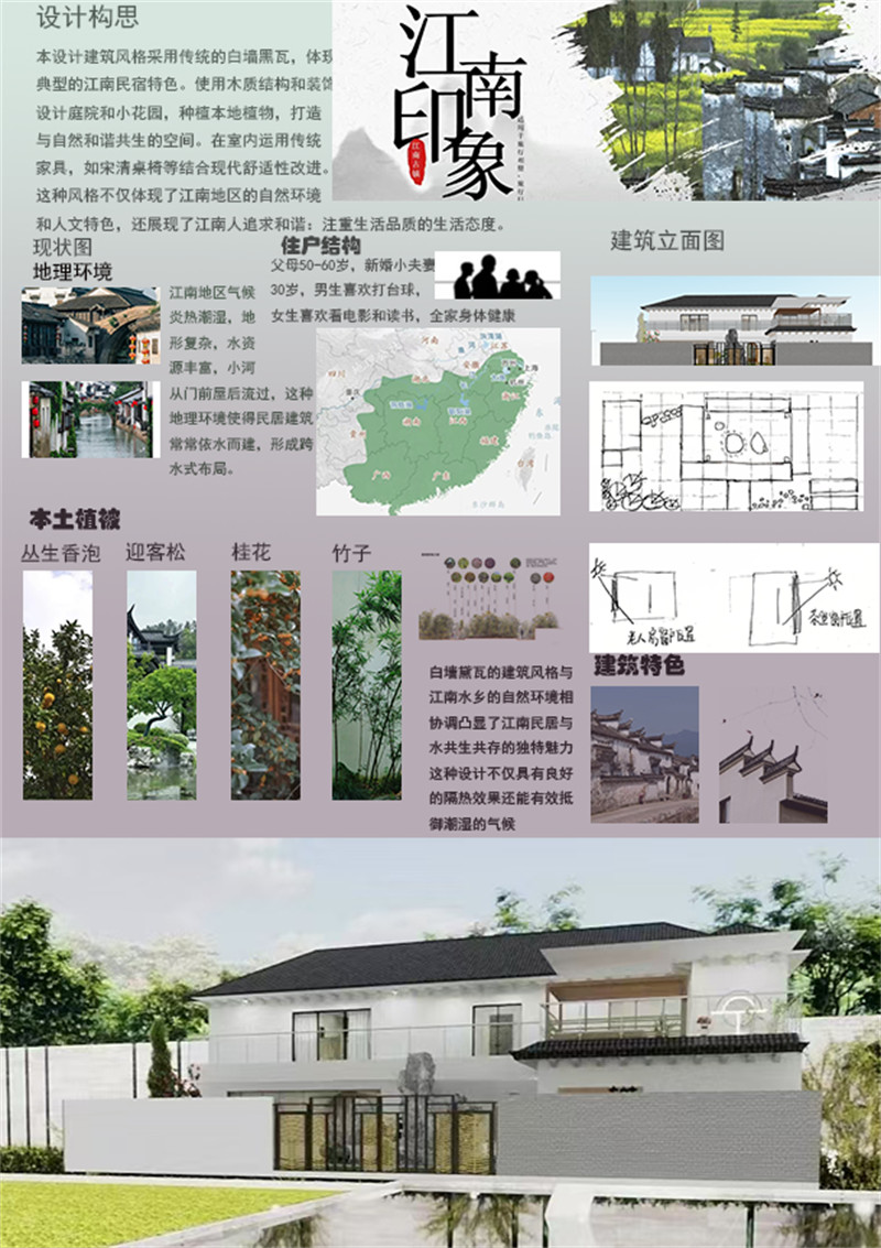 本设计旨在打造一个融合传统与现代、自然与人文的江南民宿,通过精心设计的环境和细节,为游客提供一个舒适、有文化氛围的居住空间。