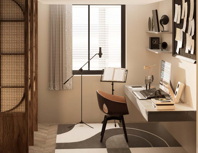 原本的电视柜墙体被精心改造成与音乐室紧密相连的四扇门,这一设计不仅巧妙地提供了便捷的进出通道,更是在视觉上极大地扩展了整体空间感。四扇门的存在仿佛打破了空间的界限,让音乐室的韵律与客厅的温馨无缝对接,营造出一种更为宽敞、明亮的家居氛围。这种设计实现了空间上的创新融合,既保留了电视墙原有的功能,又赋予了其新的生命,成为连接两个世界的桥梁。
