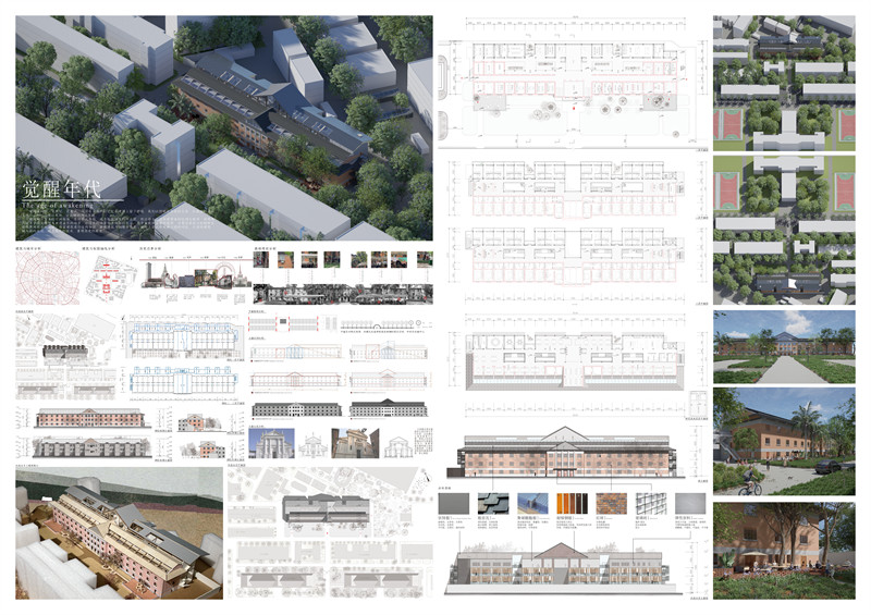 场地位于校园后部,虽然是校园轴线最终的建筑,但远离师生生活片区,不易到达,缺乏活力。建筑主立面形式对称庄重,比例严谨,材料上红砖与水磨石的运用让建筑的气质稳重沧桑;但建筑后侧与两端由于多次加建与自建,缺乏形象的维护。同时建筑前侧场地树木繁茂,具有良好的景观条件。因此建筑对校园轴线的回应,对师生生活需求的满足,对历史建筑的形象气质的呈现是本案的核心。