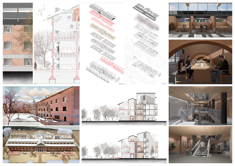 对保留的前侧建筑,参考历史建筑保护性加固案例砌体结构册中的做法,通过钢筋网砂浆的方式进行加固。新旧墙体竖向的链接主要靠嵌砌咬接,在外部不设置构造柱的同时,维护主立面形象的同时保持稳定;后侧的建筑采用钢结构,与原本的砖混相连接,延续前侧砖混建筑的格局,让建筑南北两侧形成新与老,钢与砖混的对话。前侧是红砖水磨石带来的稳重质感,后测是钢结构与局部轻质维护带来的轻盈质感。使用者顺着竖向交通设置的路径游走其中,感受老建筑的历史痕迹。让老的建筑,融入新的生活;利用现代的技术,重现历史的痕迹.