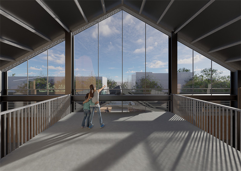 我们将建筑的一层设置为公共休闲空间结合服务空间等,中部设置入住大堂,便于专家办理入住,二三层设置为建筑的客房部分,三层设置为用餐空间,在中部山花的部分集中设置夹层空间,利用山花的坡屋顶引导实现,给予游览者一个回望校园中轴线的视角,更加直观的感受到校园轴线的秩序。