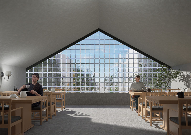 延续建筑对称式的布局,由于原本横向宿舍功能模式的空间划分,顺势将建筑改造为专家接待中心,将客房与原本空间格局嵌合,同时利用中部的走廊空间打开竖向垂直空间,从屋顶引入光线,增加自然采光。在过去的空间中上演新的生活;为专家提供温馨的居所,为周边居民与校园师生提供休闲娱乐的选择。