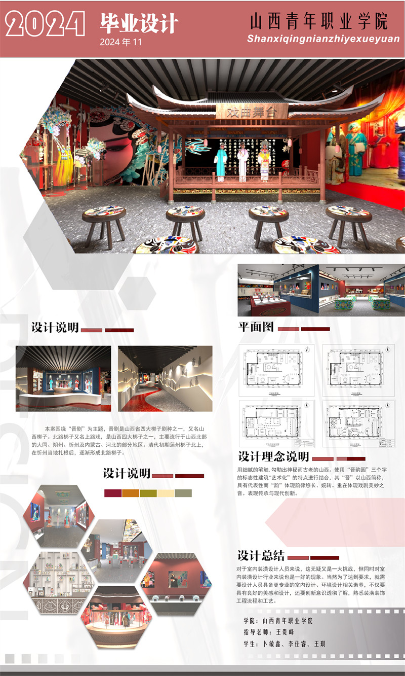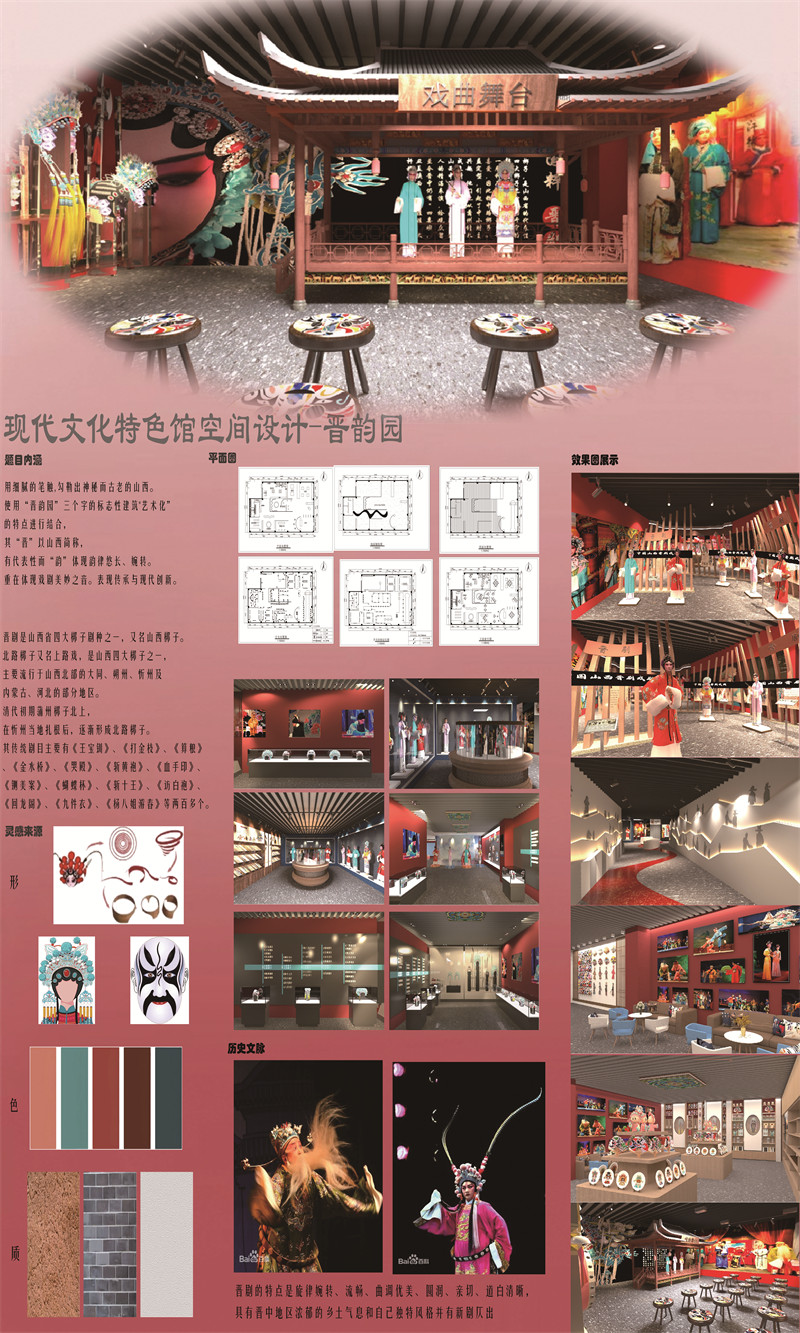 3.设计理念及思路:该项目用细腻的笔触,勾勒出神秘而古老的山西。使用“晋韵园”三个字的标志性建筑“艺术化”的特点进行结合,其“晋”以山西简称,具有代表性而“韵”体现韵律悠长、婉转。重在体现戏剧美妙之音。表现传承与现代创新。晋剧是山西非遗文化之一,唱腔和表演不仅具有梆子腔的激越、粗犷的一般特点,而且具有比较圆润和工细的独特风格。因而,既能表现慷慨激昂的历史故事,也能表现优美健康的民间生活。在这里你可以近距离欣赏戏曲服饰、面具,还可以感受珍贵的戏曲资料和影像。这不仅是传统文化的展示,更是现代人探索戏曲之美的理想之地。在这里,有传统与现代完美融合,给你一场视觉与心灵的盛宴。