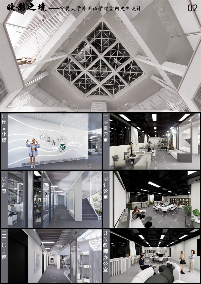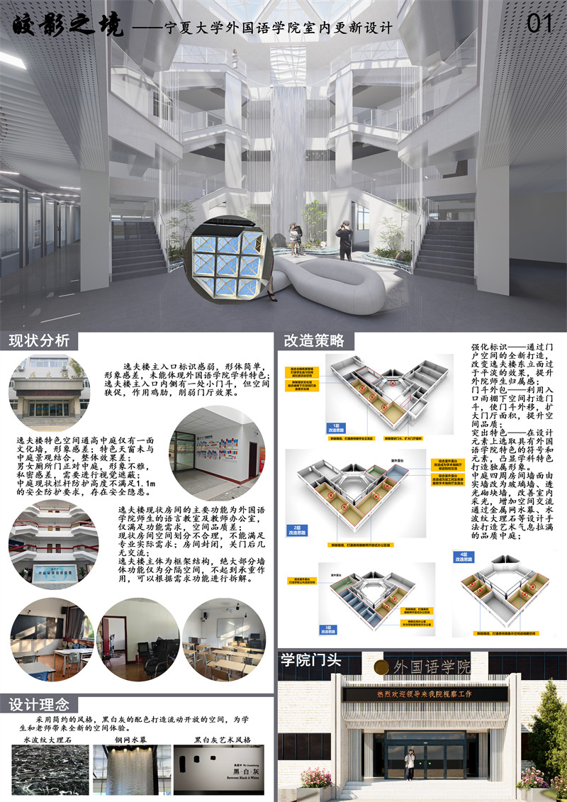 强化标识——通过门户空间的全新打造,改变逸夫楼东立面过于平淡的效果,提升外院师生归属感;门斗外包——利用入口雨棚下空间打造门斗,使门斗外移,扩大门厅面积,提升空间品质;突出特色——在设计元素上选取具有外国语学院特色的符号和元素,凸显学科特色,打造独属形象。