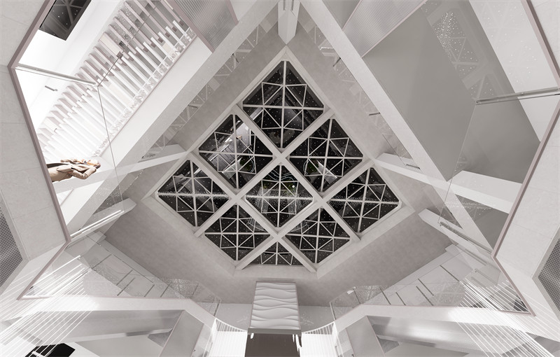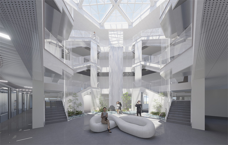 中庭四周房间墙面由实墙改为玻璃墙、透光砌块墙,改善室内采光,增加空间交流;改造思路——通过金属网水幕、水波纹大理石等设计手法打造艺术气息拉满的品质中庭