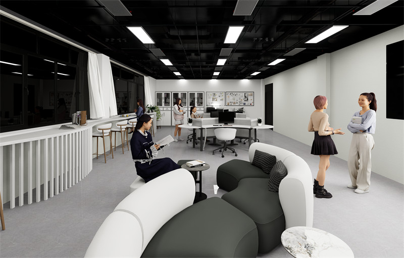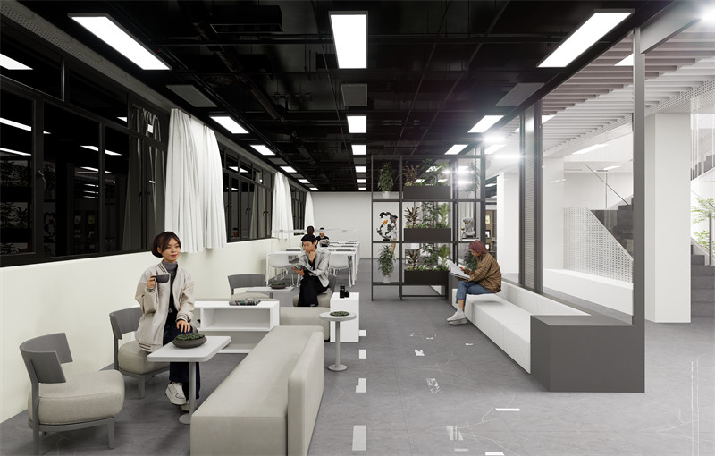 学生空间——将多个小房间打通,打造贯通式学习交流空间;以玻璃墙面向中庭,提升空间采光效果;