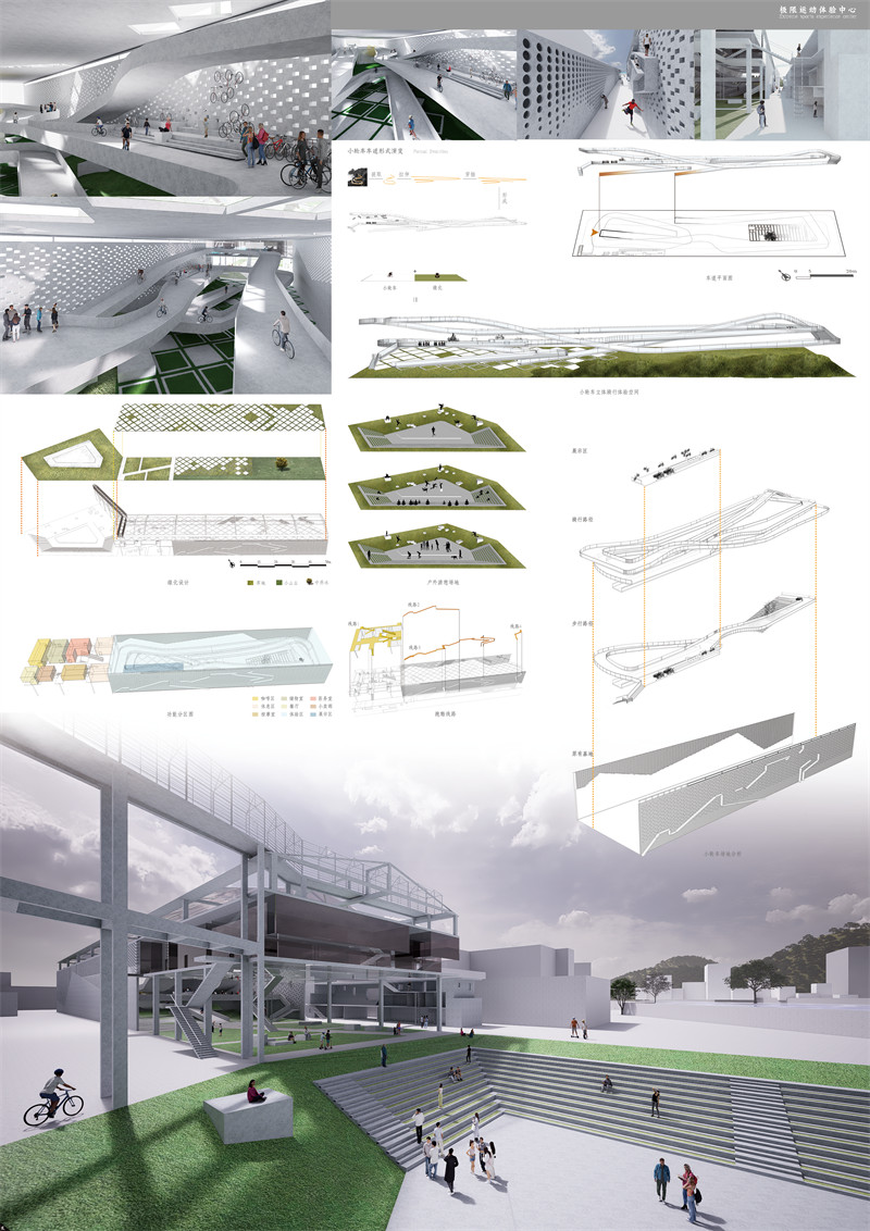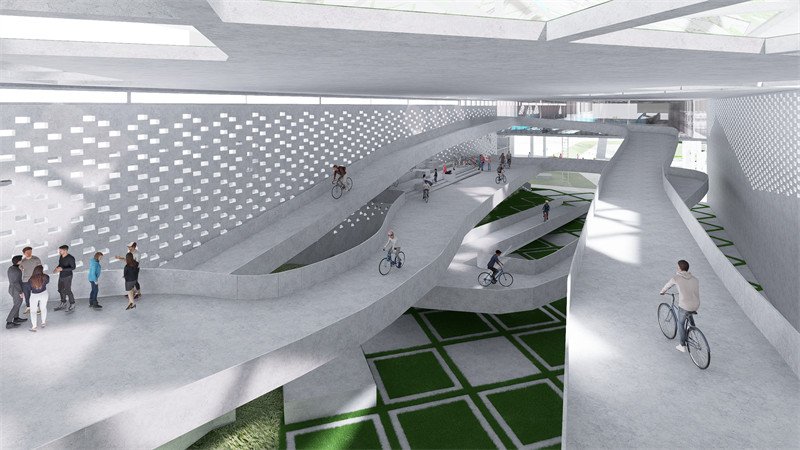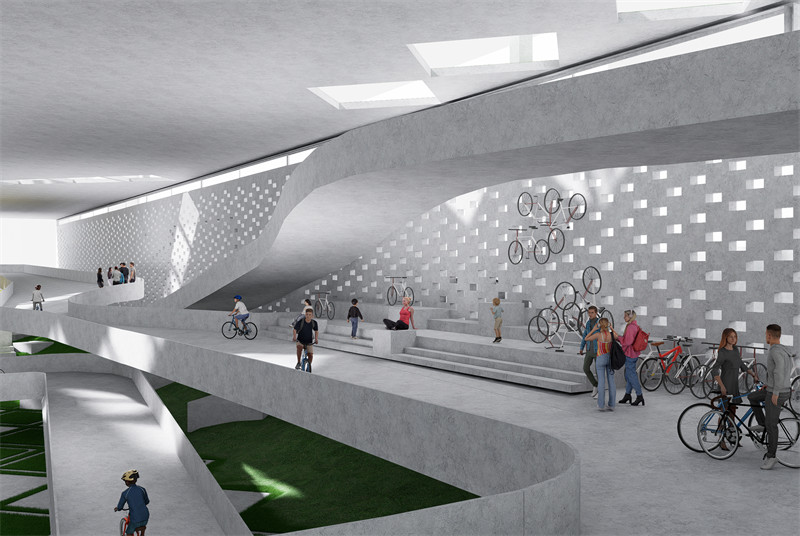 该项目从小轮车,跑酷和攀岩三方面进行设计,核心是小轮车体验。根据不同极限运动项目特点,打造专业化场地。小轮车体验空回设计来源于山的形体与形态。根据山的起伏进行演绎,诠释出山的那种连绵起伏,参差不齐的形态,营造出原野的气息,小轮车车道和微地形小山坡相结合,犹如进入大山里,呼吸自然的气息。这就使我们放慢脚步来感受生活,从中寻找刺激。