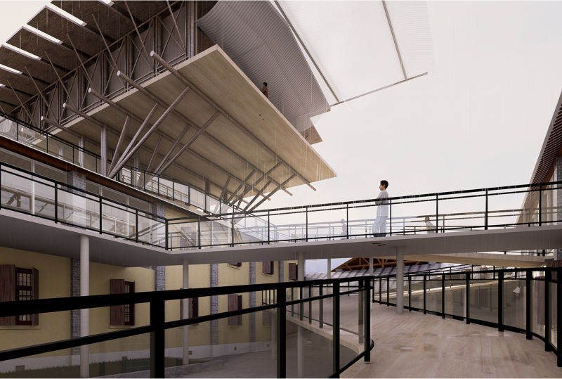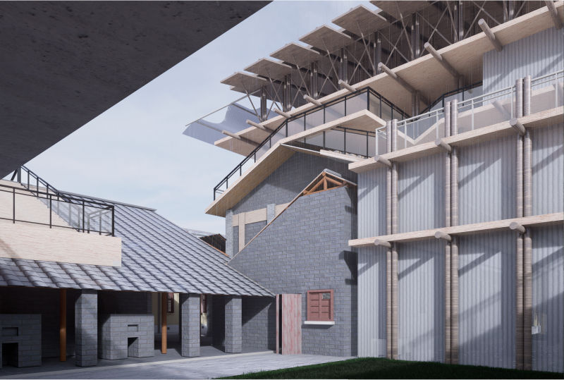 场地内除主体为一栋东西走向的茧库与三栋南北走向的茧库,形成一横三纵的格局外,还带有各类附属建筑如检测房、宿舍、食堂、储煤房、水塔等。其中部分附属建筑的价值不高,无保留的必要。建筑外部墙体采用青砖材质,屋顶则为平板洋瓦。建筑内部结构采用木制承重结构,原有的结构已无法满足建筑后期的使用或者其他功能下的荷载,需做结构上的转化。建筑围护结构也已经残败不堪,可保留部分墙体,许对建筑的密闭性和空间舒适度等都有一个统一的设计。