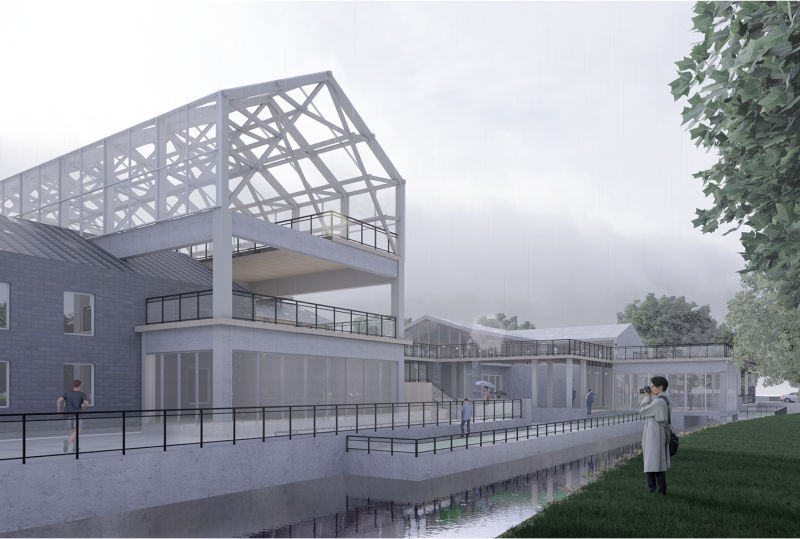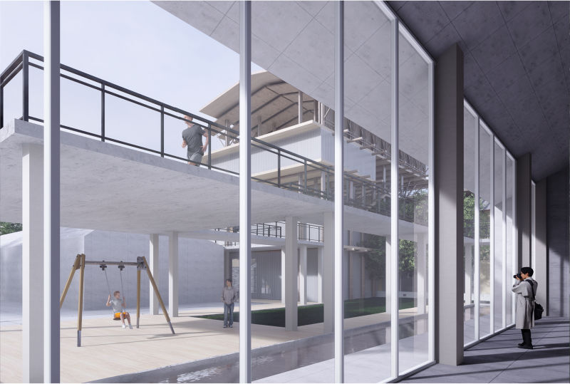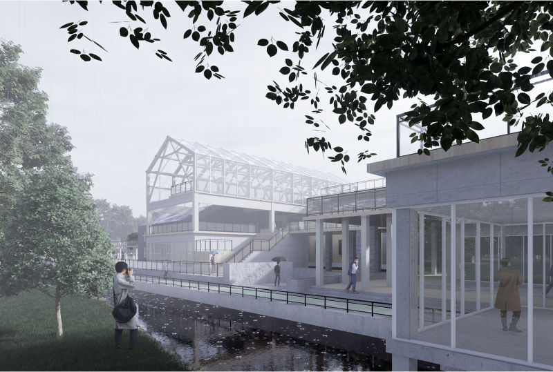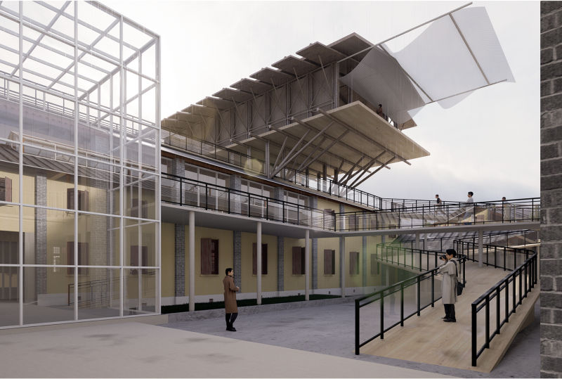 对于场地内保留的三大部分单体改造分析.首先在原有的结构基础上设置钢结构,让其能够满足后期功能需求,在图中可以明显看出新老结构之间材质的对比.然后再通过对于内部空间设计,高差,装置,墙体等手法将空间划分,提高空间体验感.下面是对内部展览空间的示意,深灰色的为新建结构,新结构与老建筑之间相隔一米,使其基础避免相碰,如第一张图中,新老建筑通过玻璃体包围,将其也作为展览的一部分.以及层层高差处理,让不同高度的人群也能相互产生联系。